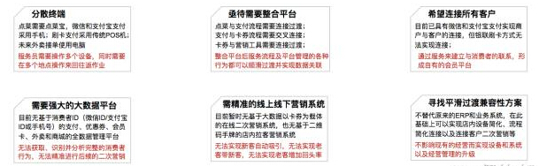 分散的終端給服務(wù)員增加了大量的工作。餐廳點菜時需要點菜寶,用微信支付寶等支付時,需要的終端是手機,傳統(tǒng)刷卡支付需要傳統(tǒng) POS 機,服務(wù)員往往需要往返多次,耗時耗力。這種情況下,急需要一個整合的平臺,可以實現(xiàn)從點菜到支付的一體化的連接,支付與卡券核實的連接,卡券與營銷工具的連接。整合后的平臺,可以讓服務(wù)流程與平臺管理的各種行為順利過度并實現(xiàn)數(shù)據(jù)關(guān)聯(lián)。