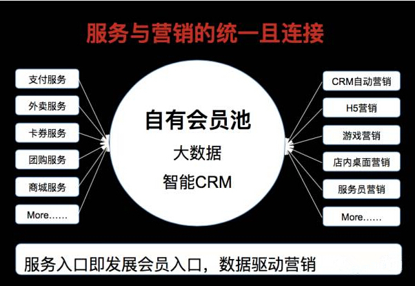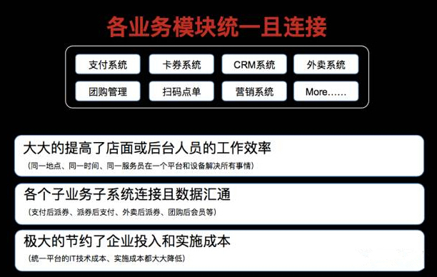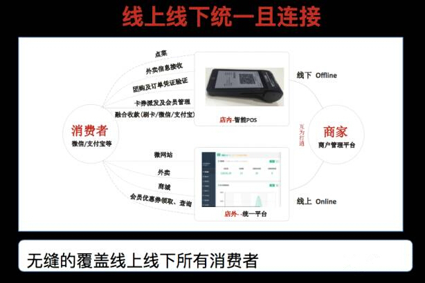 所有系統(tǒng)的商家通過統(tǒng)一平臺,實現(xiàn)打通,從而無縫的覆蓋線上線下所有消費者。比如餐廳的一個消費行為,不管是從外賣平臺過來的,還是從團(tuán)購中過來的,抑或直接從線下過來的,只要消費,就從同一終端進(jìn)行解決,然后后臺同一系統(tǒng)進(jìn)行記錄和跟蹤消費者數(shù)據(jù)。